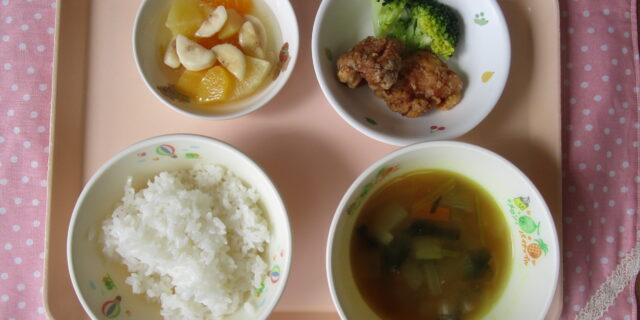 1月22日のメニュー ・ごはん ・鶏のから揚げ ・ブロッコリー ・カレースープ ・フルーツポンチ