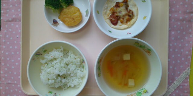 3月3日のメニュー ・いろどりごはん ・ミニピザ ・チキンナゲット ・ブロッコリー ・和風スープ
