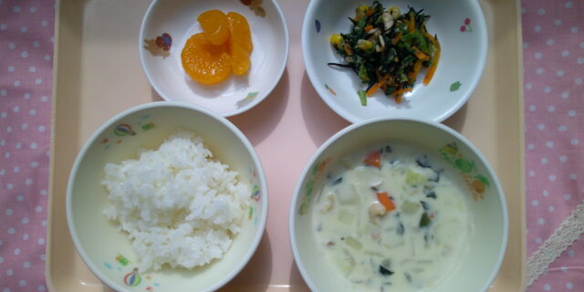 3月6日のメニュー ・ごはん ・青梗菜のクリーム煮 ・ひじきとツナのサラダ ・みかん缶
