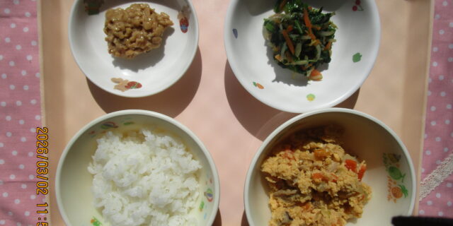 3月2日のメニュー ・ごはん ・親子煮 ・ほうれん草のお浸し ・おかか納豆