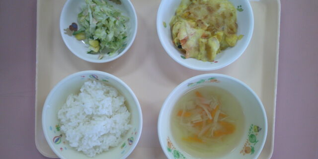 12月22日のメニュー ・ごはん ・かぼちゃのグラタン ・グリーンサラダ ・コンソメスープ