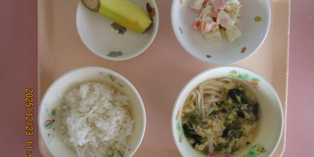 12月23日のメニュー ・ごはん ・かき玉うどん汁 ・コロコロサラダ ・バナナ
