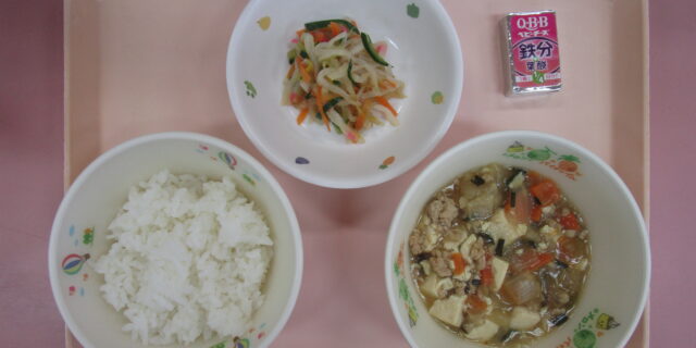 12月26日のメニュー ・ごはん ・カレーマーボー豆腐 ・中華和え ・チーズ