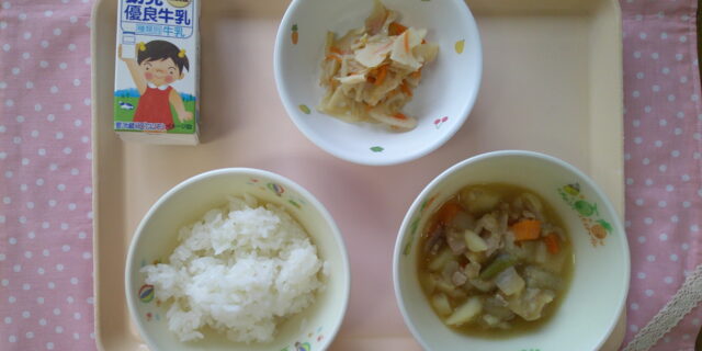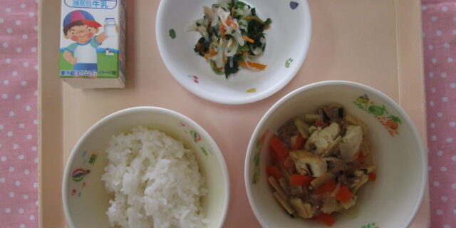 2月6日のメニュー ・ごはん ・鶏肉とじゃが芋の煮物 ・もやしとれんこんのサラダ ・牛乳