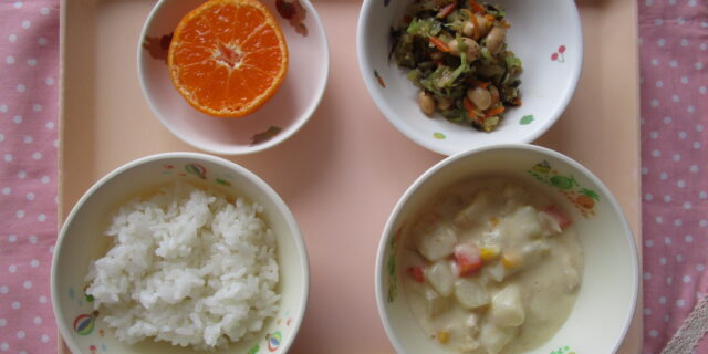 2月9日のメニュー ・ごはん ・コーンシチュー ・大豆とひじきのごまサラダ ・みかん