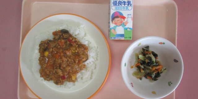 9月12日のメニュー ・茄子とひき肉のカレーライス ・わかめサラダ ・牛乳