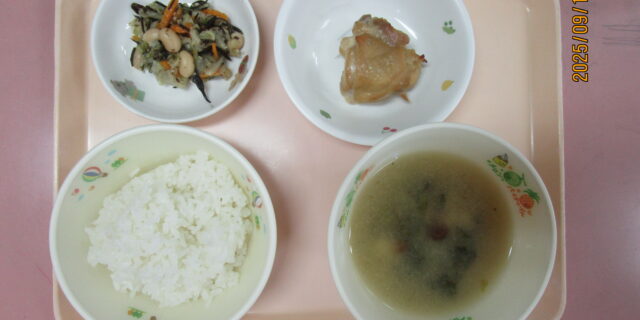 9月16日のメニュー ・ごはん ・鶏肉の照り焼き ・大豆とひじきのごまサラダ ・なめこ汁