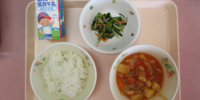 9月19日のメニュー ・ごはん ・ポークビーンズ ・青菜の塩昆布和え ・牛乳