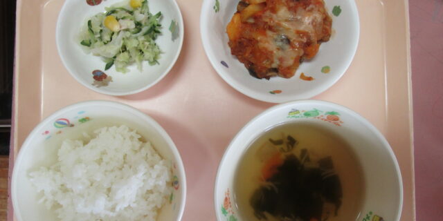 9月22日のメニュー ・ごはん ・茄子とポテトのミートグラタン ・グリーンサラダ ・わかめスープ