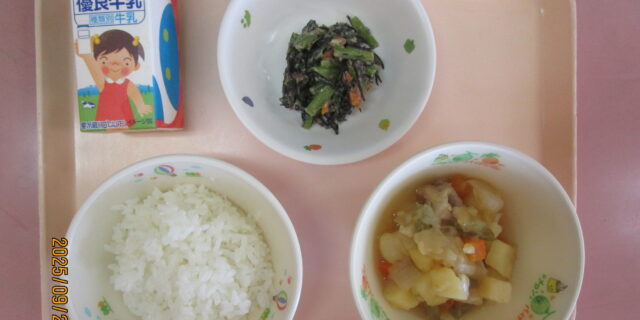 9月24日のメニュー ・ごはん ・鶏肉とじゃが芋の煮物 ・ひじきと青菜のサラダ ・牛乳