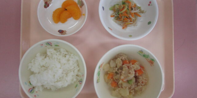 10月28日のメニュー ・ごはん ・じゃが芋のそぼろ煮 ・もやしのナムル ・みかん缶
