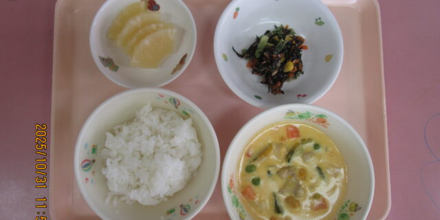 10月31日のメニュー ・ごはん ・かぼちゃシチュー ・ひじきとツナのサラダ ・パイン缶
