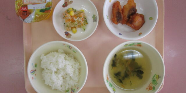 11月6日の給食 ・ごはん ・魚のケチャップ和え ・だいコーンサラダ ・青梗菜のスープ ・デザート