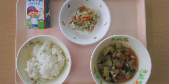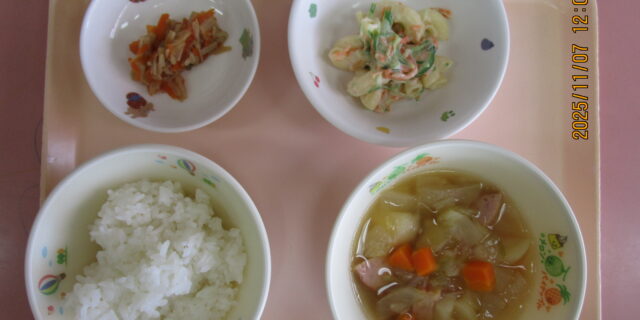 11月7日のメニュー ・ごはん ・洋風煮込み ・マカロニサラダ ・手作りなめたけ