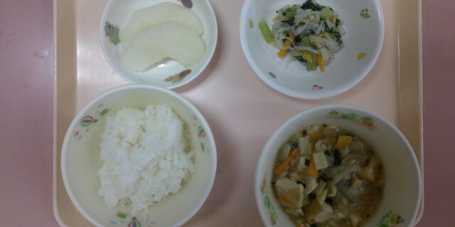 9月8日のメニュー ・ごはん ・厚揚げの中華煮 ・こまツナサラダ ・梨