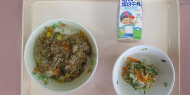 9月12日のメニュー ・茄子とひき肉のカレーライス ・わかめサラダ ・牛乳