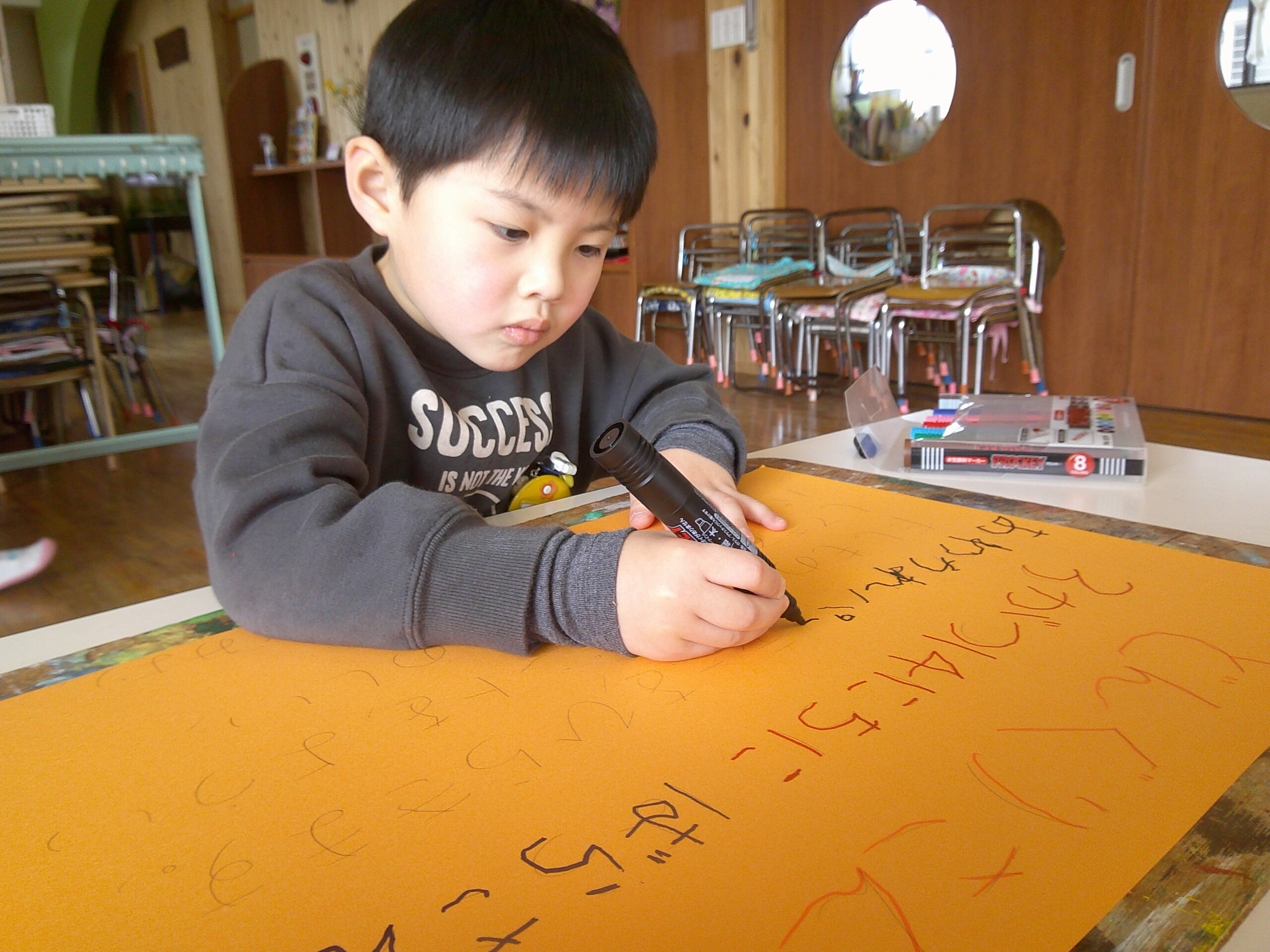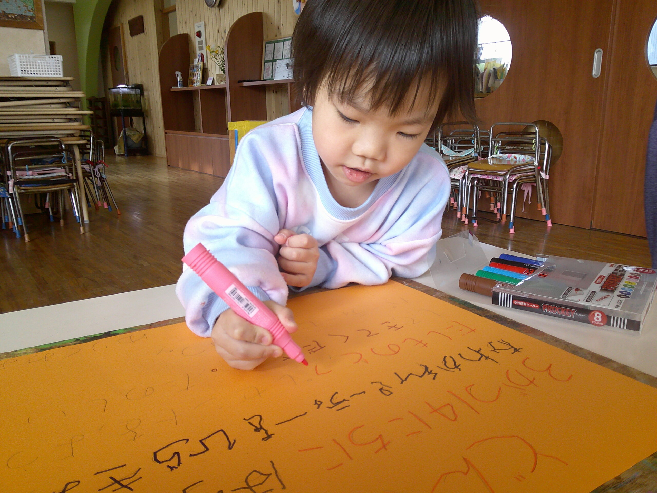 ひらがなを書けるようになった子もいるゆりさん。それぞれ書く場所を役割分担して、みんなで招待状を完成させました。クラスへ届けるときには、