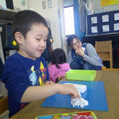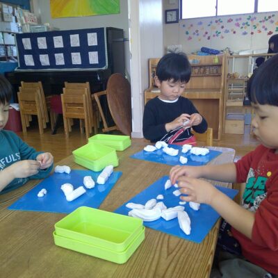 粘土を使う時のお約束を一緒に確認してから、早速みんなで遊びました。