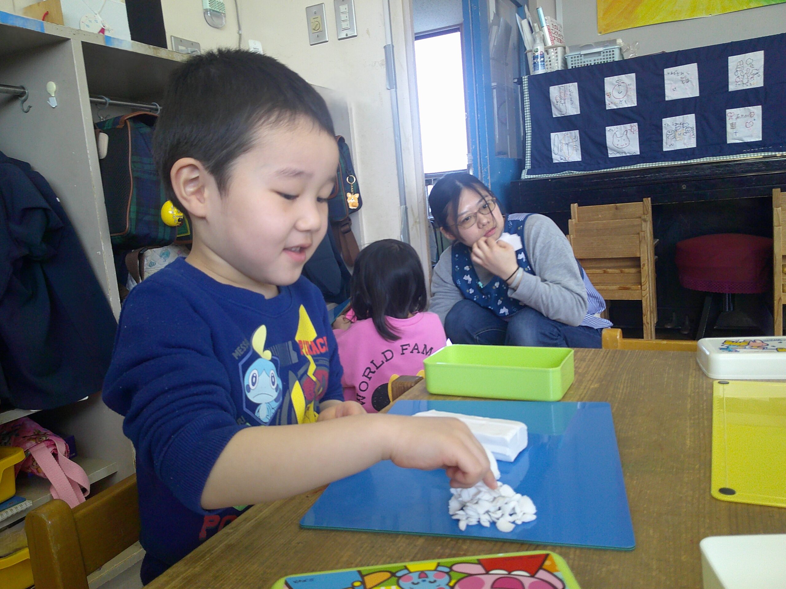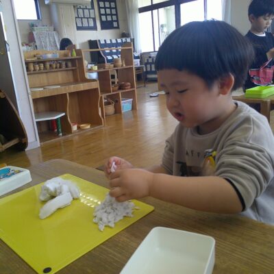 ゆり組さんは自分たちの手元に届いた新しい粘土に、「これぼくの粘土!?」「使っていいの?」「早く粘土したい!」と興味深々です。