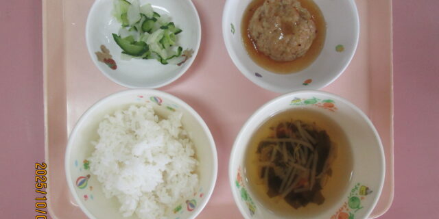 10月6日のメニュー ・ごはん ・和風煮込みハンバーグ ・きゃべつの浅漬け ・わかめスープ