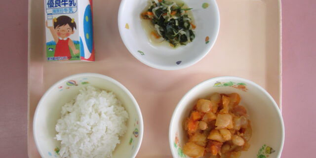 10月9日のメニュー ・ごはん ・大豆とポテトのチリソース ・わかめともやしの和え物 ・牛乳