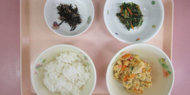10月14日のメニュー ・ごはん ・麩の卵とじ ・おひたし ・ツナひじきふりかけ