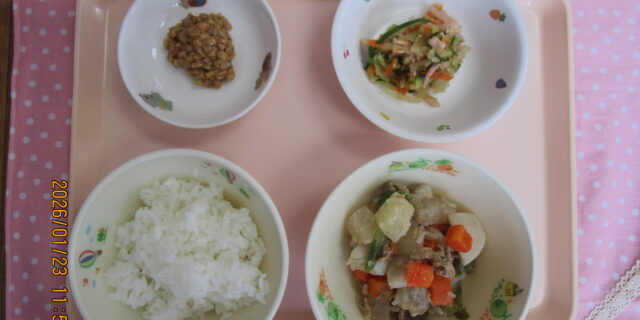 1月23日のメニュー ・ごはん ・豚肉と里芋のみそ煮 ・切り干し大根のサラダ ・おかか納豆