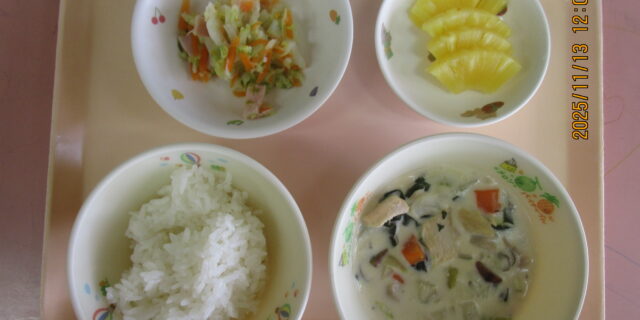 11月13日のメニュー ・ごはん ・青梗菜のクリーム煮 ・ハムのマリネ ・パイン缶