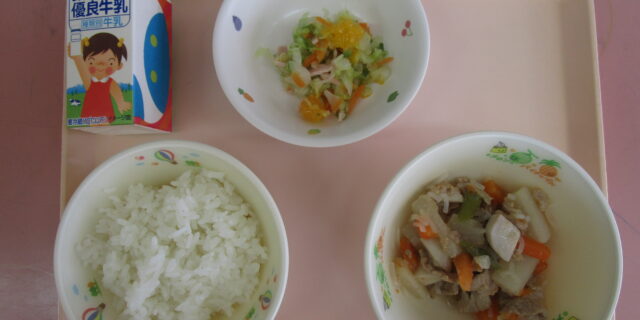 11月17日のメニュー ・ごはん ・豚肉と里芋のみそ煮 ・フレンチサラダ ・牛乳
