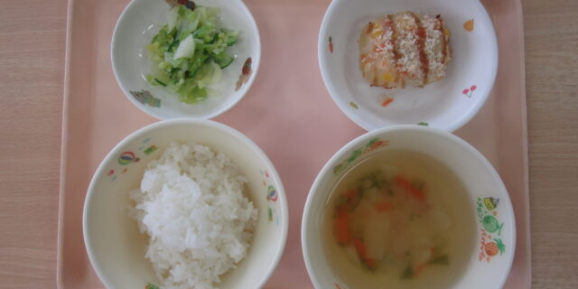 11月6日の給食 ・ごはん ・魚のケチャップ和え ・だいコーンサラダ ・青梗菜のスープ ・デザート