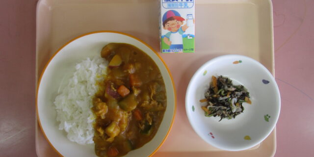 11月20日のメニュー ・かぼちゃの秋色カレーライス ・ひじきとツナのナムル ・牛乳