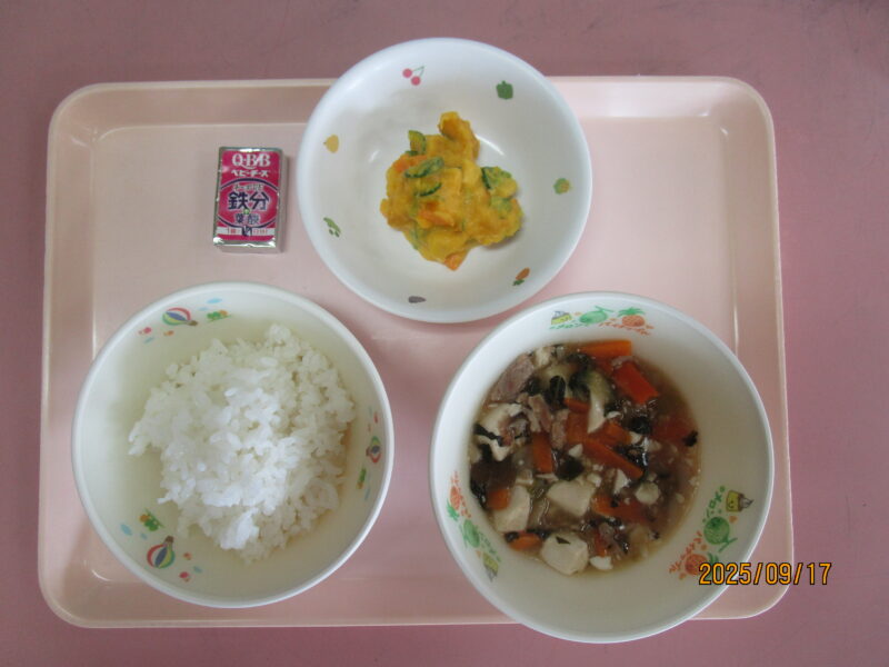 ・ごはん ・豆腐と豚肉のうま煮 ・かぼちゃサラダ ・チーズ