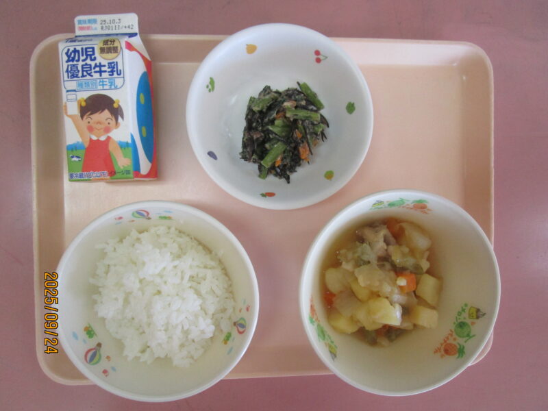 ・ごはん ・鶏肉とじゃが芋の煮物 ・ひじきと青菜のサラダ ・牛乳
