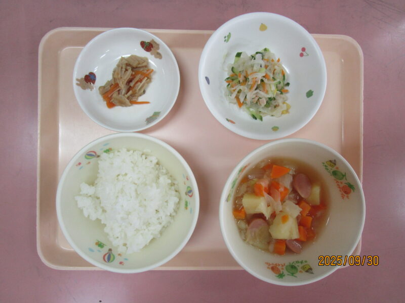 ・ごはん ・洋風煮込み ・だいコーンサラダ ・手作りなめたけ