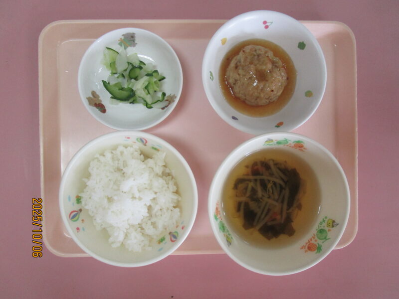 ・ごはん ・和風煮込みハンバーグ ・きゃべつの浅漬け ・わかめスープ