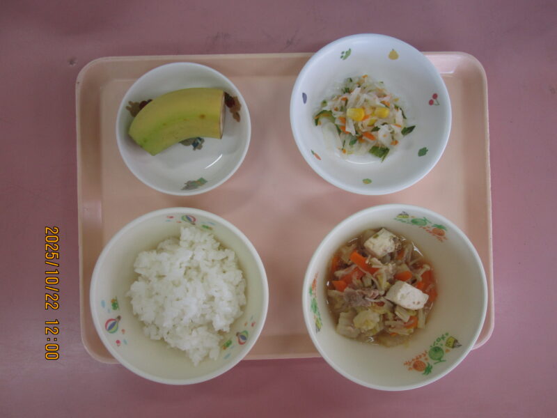 ・ごはん ・すき焼き風煮 ・だいコーンサラダ ・バナナ