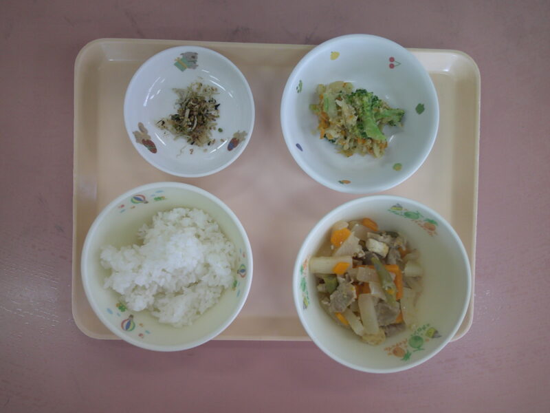 ・ごはん ・豚肉と大根の炒め煮 ・ブロッコリーのごま和え ・手作りふりかけ