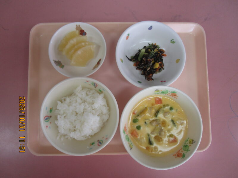 ・ごはん ・かぼちゃシチュー ・ひじきとツナのサラダ ・パイン缶