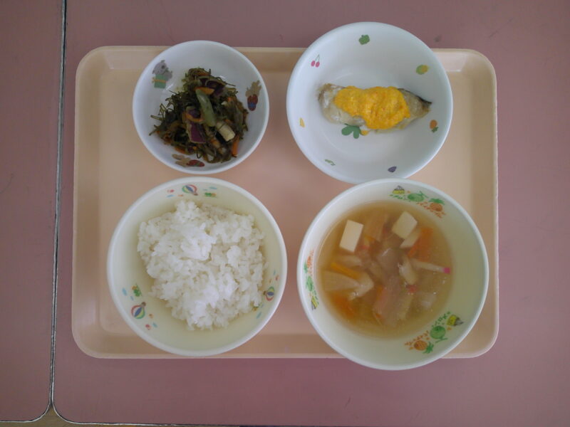 ・ごはん ・白身魚のあけぼの焼き ・刻み昆布の炒め煮 ・雑煮風汁