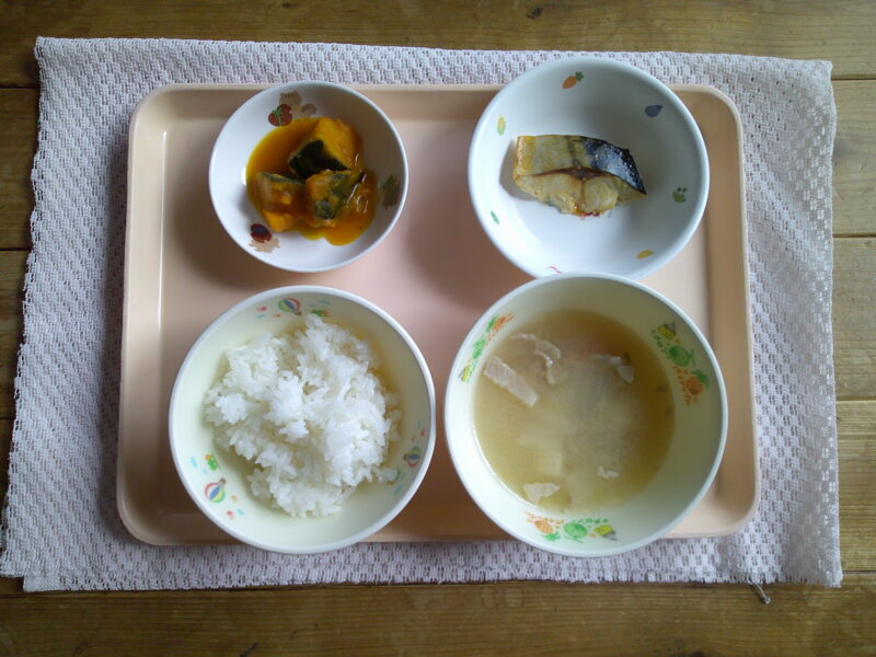 ・ごはん ・さばの塩焼き ・南瓜の甘煮 ・豚汁