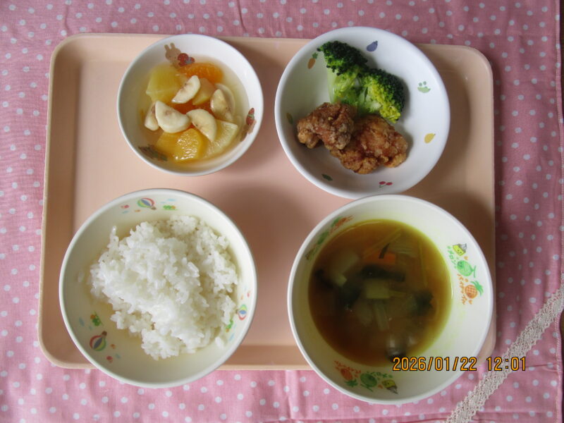 ・ごはん ・鶏のから揚げ ・ブロッコリー ・カレースープ ・フルーツポンチ