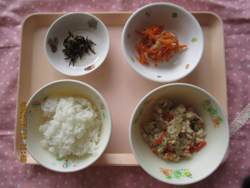 ・ごはん ・炒り豆腐 ・人参のおかか和え ・ツナひじきふりかけ