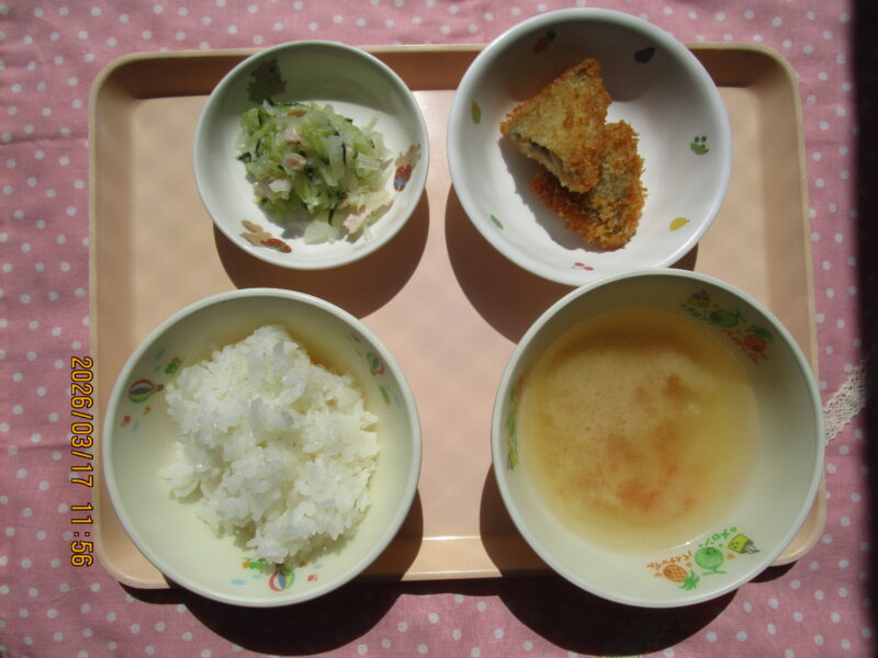 ・ごはん ・アジフライ ・ハムのマリネ ・みそ汁
