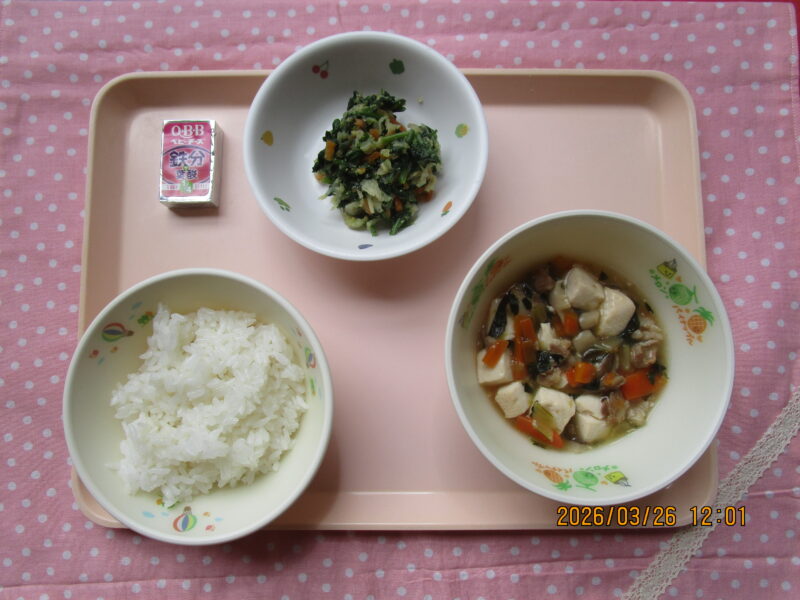 ・ごはん ・豆腐と豚肉のうま煮 ・ごま和え ・チーズ