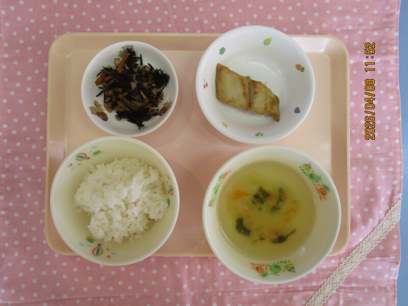 ・ごはん ・さわらのカレー焼き ・ひじき煮 ・野菜スープ