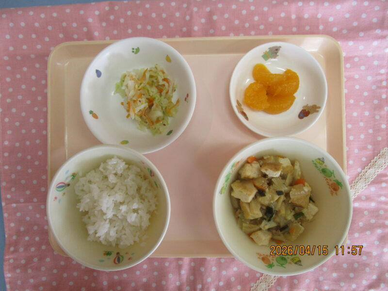 ・ごはん ・厚揚げのみそ炒め ・きゃべつのごま和え ・みかん缶
